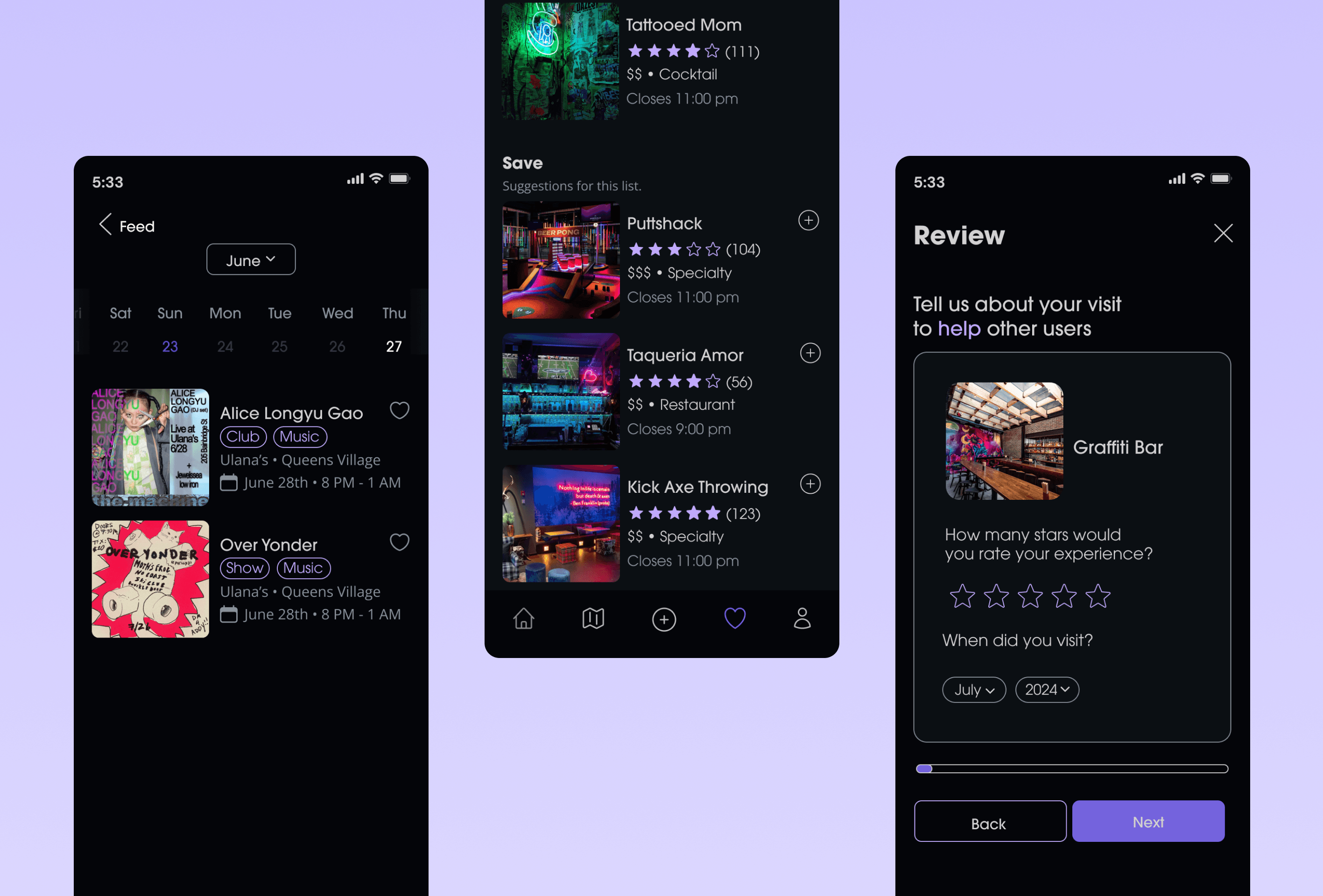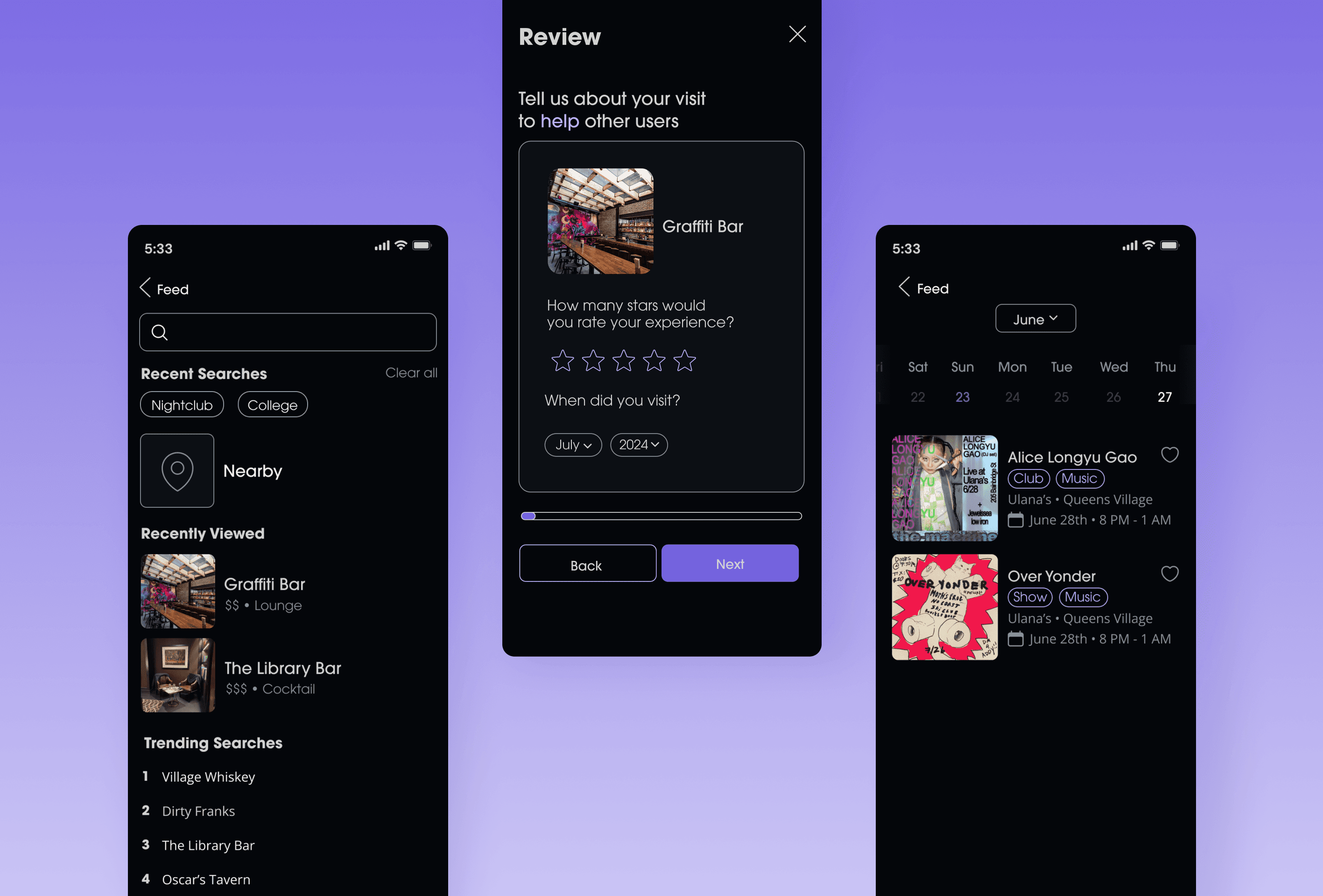Designed an interactive prototype for a travel and review app focused on nightlife and entertainment.